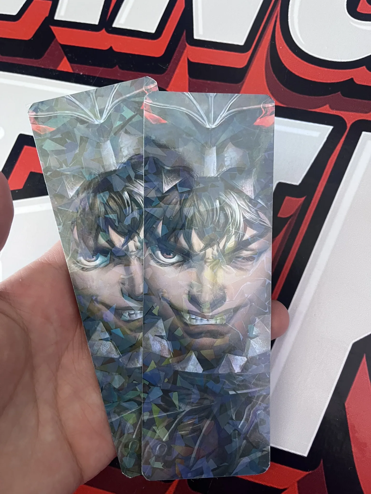 Marcapáginas holográfico de Guts con su icónica Espada del Matadragones, en un diseño oscuro y detallado. Exclusivo de Mangas Friki, misma imagen por ambos reversos.