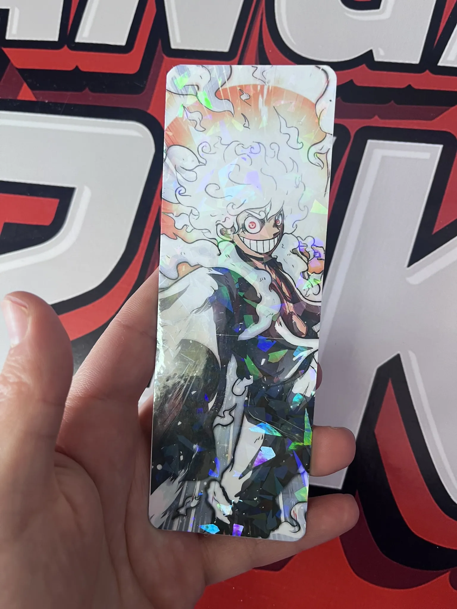 Marcapáginas holográfico de Luffy Gear Five en pleno combate. Ideal para fans de One Piece. Exclusivo de Mangas Friki, misma imagen por ambos reversos.