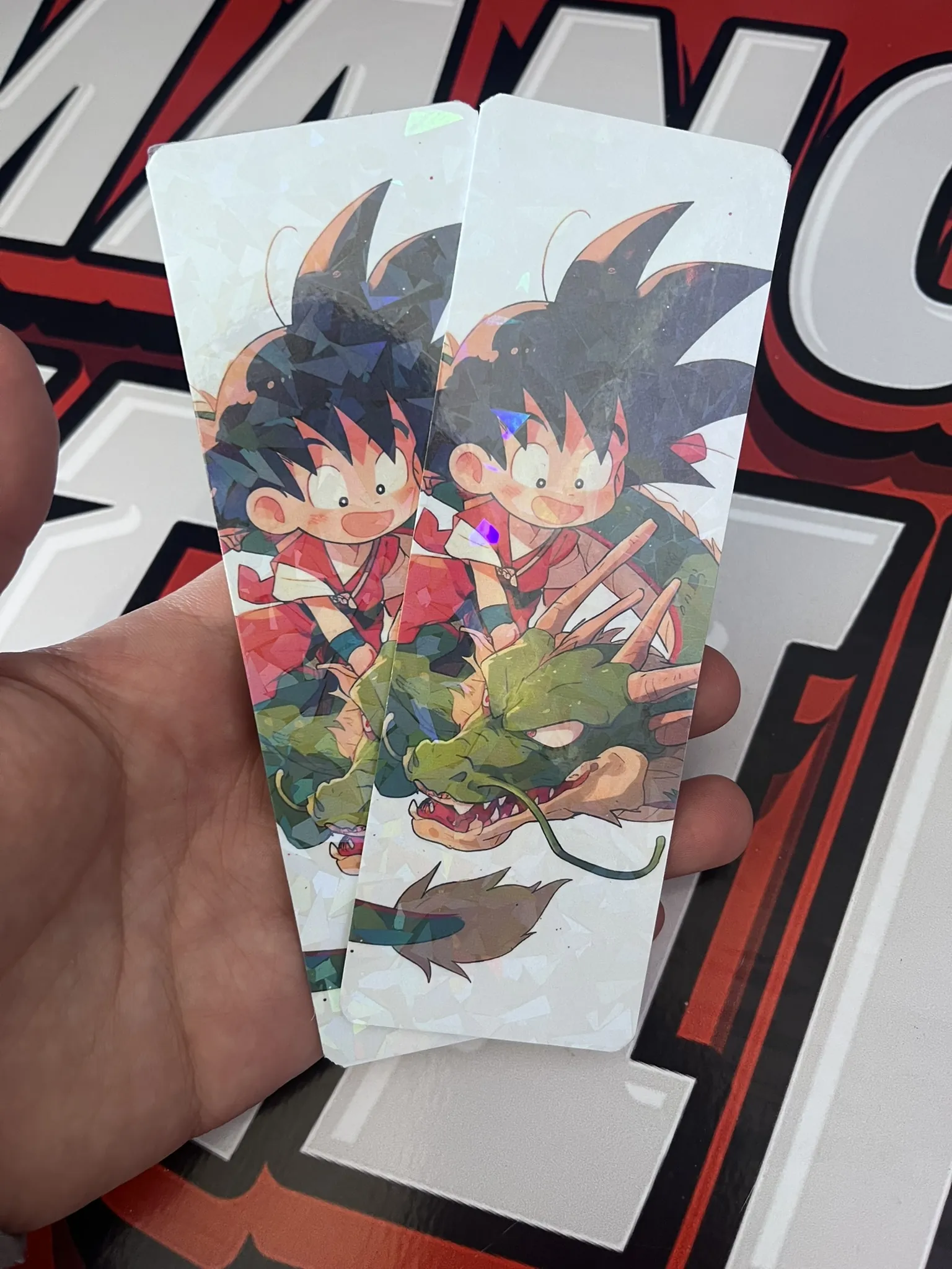 Marcapáginas holográfico de Goku niño, lleno de nostalgia y energía. Exclusivo de Mangas Friki, misma imagen por ambos reversos.